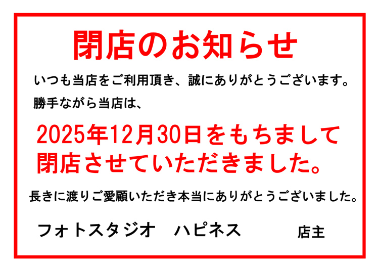 フォトスタジオ ハピネスは、平成7年にオープンさせて頂き、2025年12月で丁度30年がたちました。